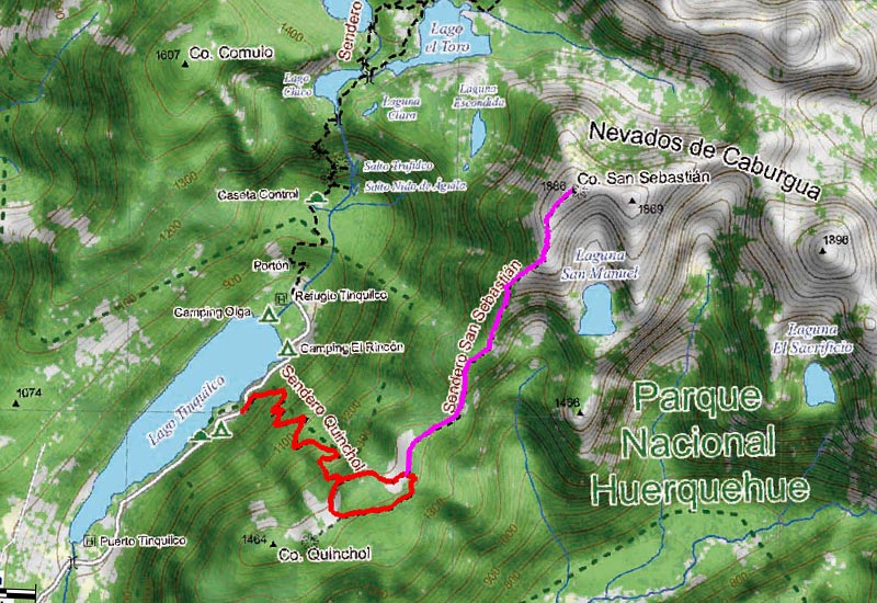 Mapa del sector, detalle tomado del mapa TrekkingChile Pucón 1:100.000